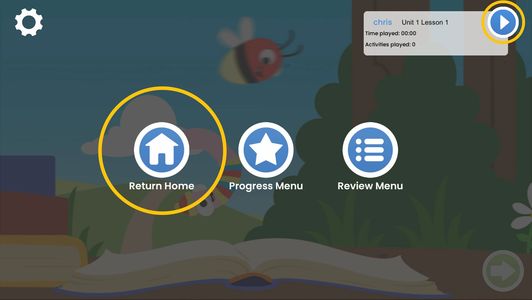 En cualquier momento los padres pueden hacer que su hijo pause la actividad (esquina superior derecha). Desde allí, entonces pueden pulsar el ícono de Home para cerrar sesión.